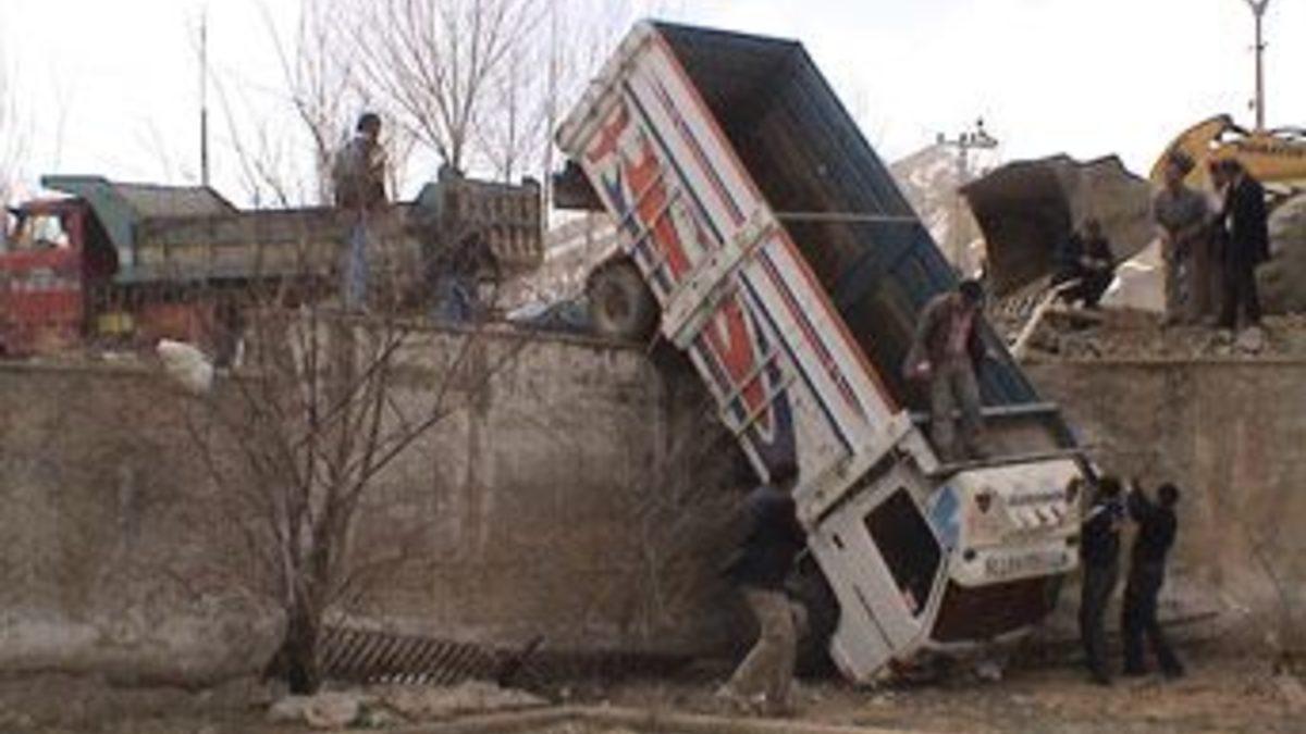 Van'ın Başkale ilçesinde kontrolden çıkan bir kamyonet 3 metre yüksekliğindeki bahçe duvarında asılı kaldı.