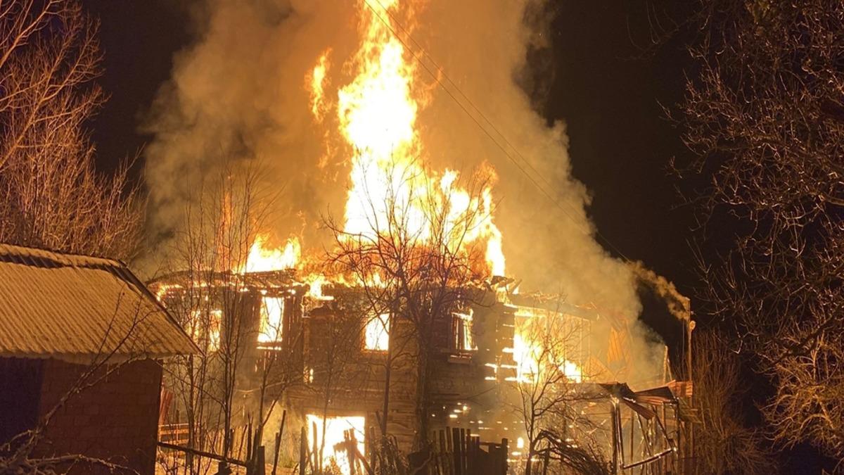 Kısa sürede büyüyen yangında alevler, 2 katlı ahşap evi tamamen sardı.