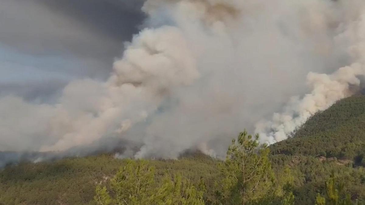 9 helikopter, 72 arazöz ve 554 personelle yangını söndürmek için ekiplerin karadan ve havadan müdahalesi devam ediyor.
