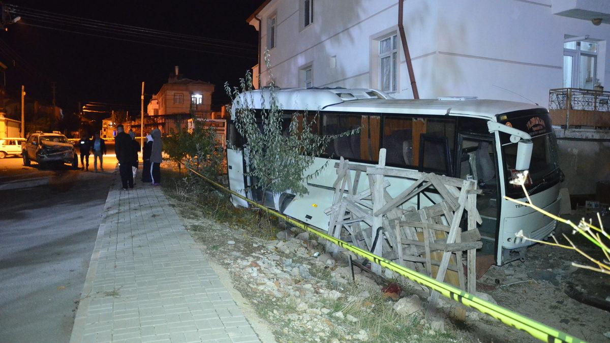 Kazada savrulan işçi servisi bir binanın duvarına çarparak durabildi.