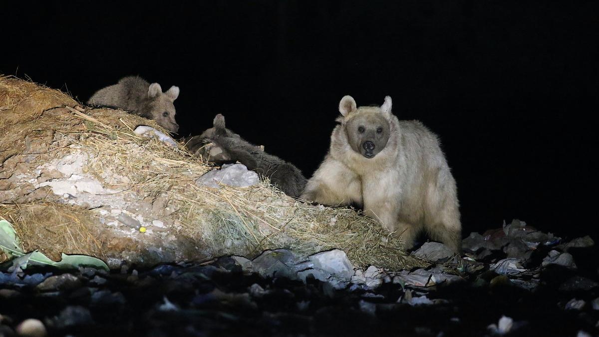 Kars'ta anne bozayı yavrularıyla çöplükte görüntülendi