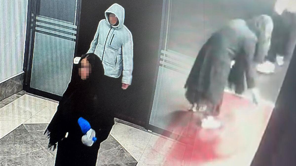 Görüntülerde bir kadın ile bir erkeğin yanlarında getirdiği sıvı ve tozu kapı önlerine ve koridora döktüklerini görünce vatandaşlar şaşkınlık yaşadı.