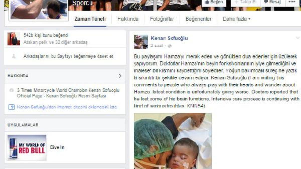 Kenan Sofuoğlu, bir süredir yoğun bakımda tedavisi süren oğlu Hamza ile çekilmiş fotoğrafını facebook'ta paylaşırken, takipçilerine tedavisinin iyiye gitmediğini açıkladı.