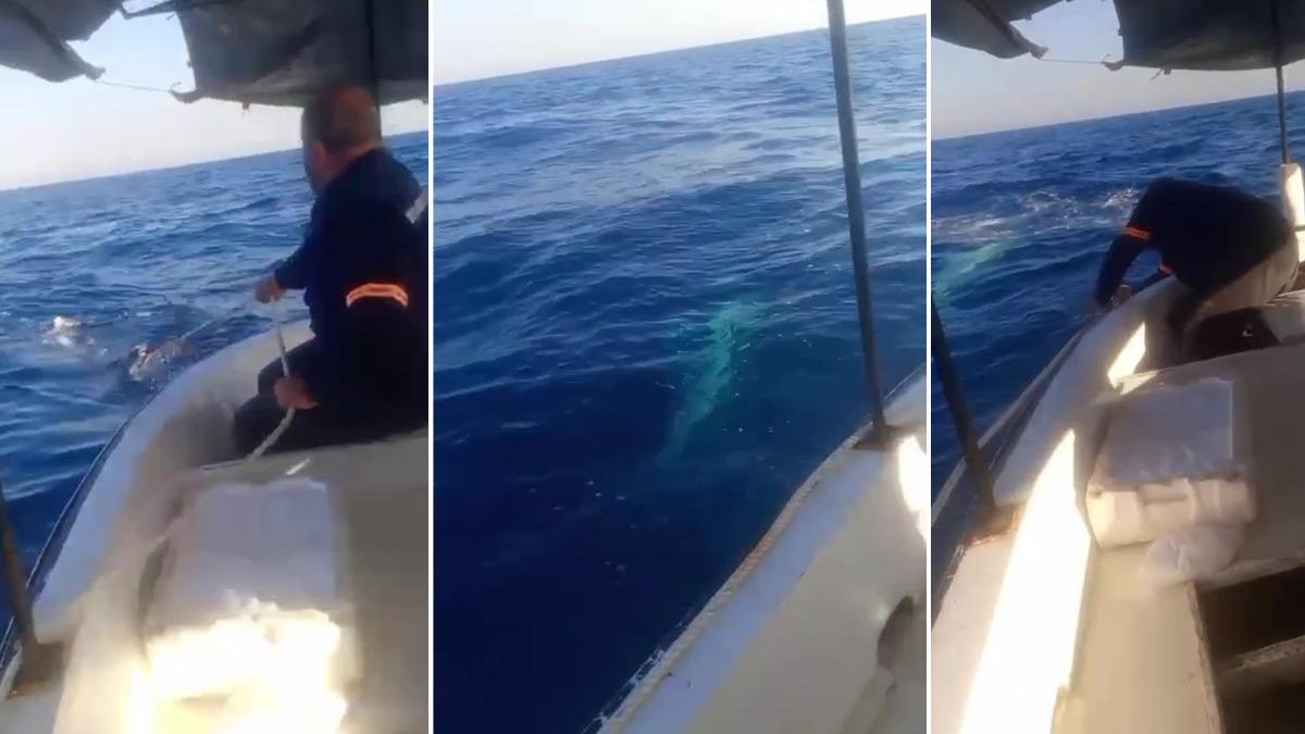 Devasa büyüklükteki köpek balığını halattan kurtarmak için 45 dakika mücadele veren Oktay ve ekibi o anları kamerayla kayıt altına aldı. Halatı silkeleyerek köpek balığını halattan kurtaran balıkçılar, köpek balığının büyüklüğü karşısında şaşkınlık yaşadıklarını söylediler.