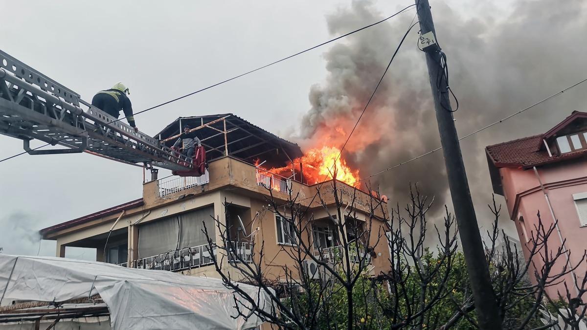 Yangın esnasında konutta mahsur kalan vatandaş kurtarılarak acil sağlık ekiplerine teslim edilirken, binanın çatısı, evin tüm odaları ve eşyaları tamamen yanarak zarar gördü.