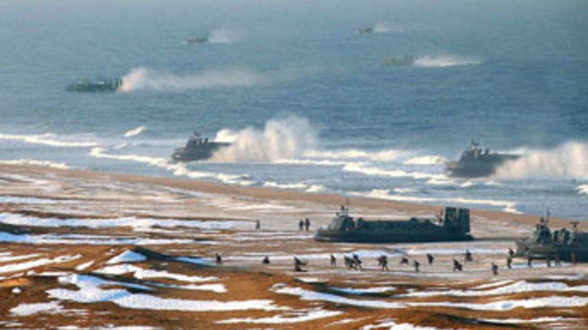 Kuzey Kore’nin resmi haber ajansı KCNA’in dünya basınına dağıttığı fotoğrafta Kuzey Kore askerleri güneşli bir havada dokuz gemiyle karaya çıkartma yaparken görülüyor. Ancak gemilerin yarısı aynı şekilde su sıçratırken burada hava tatbikat sırasında çekilen diğer fotoğraflara kıyasla çok daha güzel görünüyor.