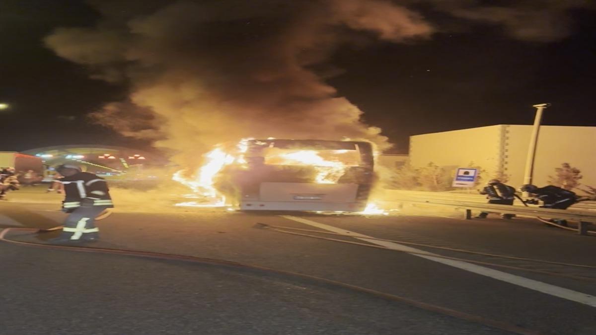Durumu fark eden sürücü, otobüsü emniyet şeridinde durdurdu. Alevler kısa sürede otobüsün tamamına yayıldı. İhbar üzerine bölgeye itfaiye, sağlık ve jandarma ekipleri sevk edildi.