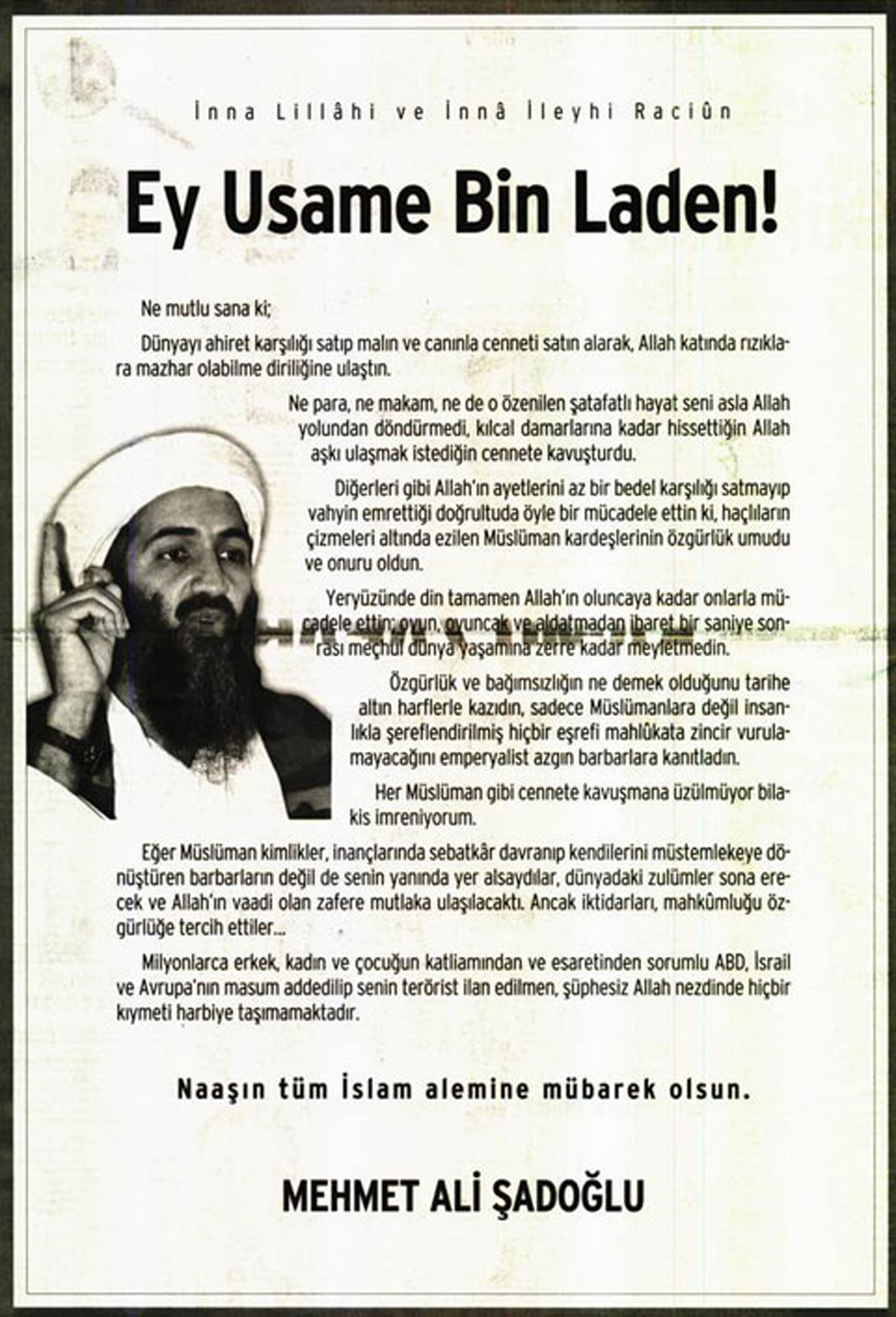 "İnna Lillâhi ve innâ lleyhi Raciûn Ey Usame Bin Laden! Ne mutlu sana ki; Dünyayı ahiret karşılığı satıp malın ve canınla cenneti satın alarak, Allah katında rızıkla- ra mazhar olabilme diriliğine ulaştın.