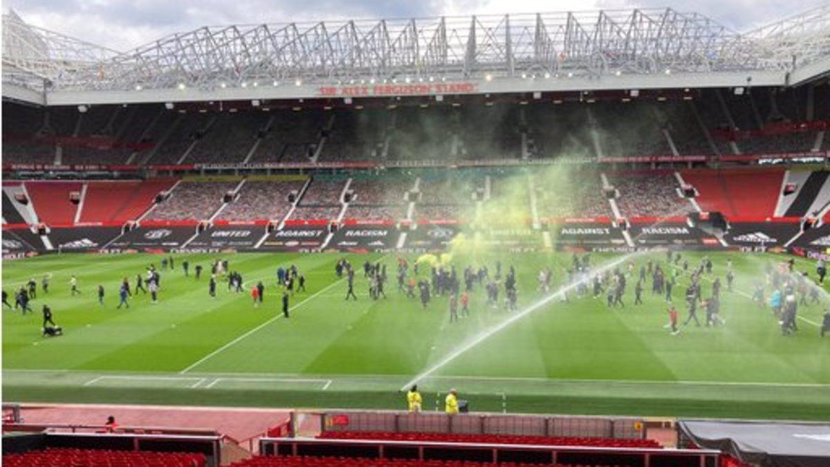 Protesto için yeşil sahaya giren United taraftarları çıkartıldı, ancak bazıları sonra sahaya geri döndü.