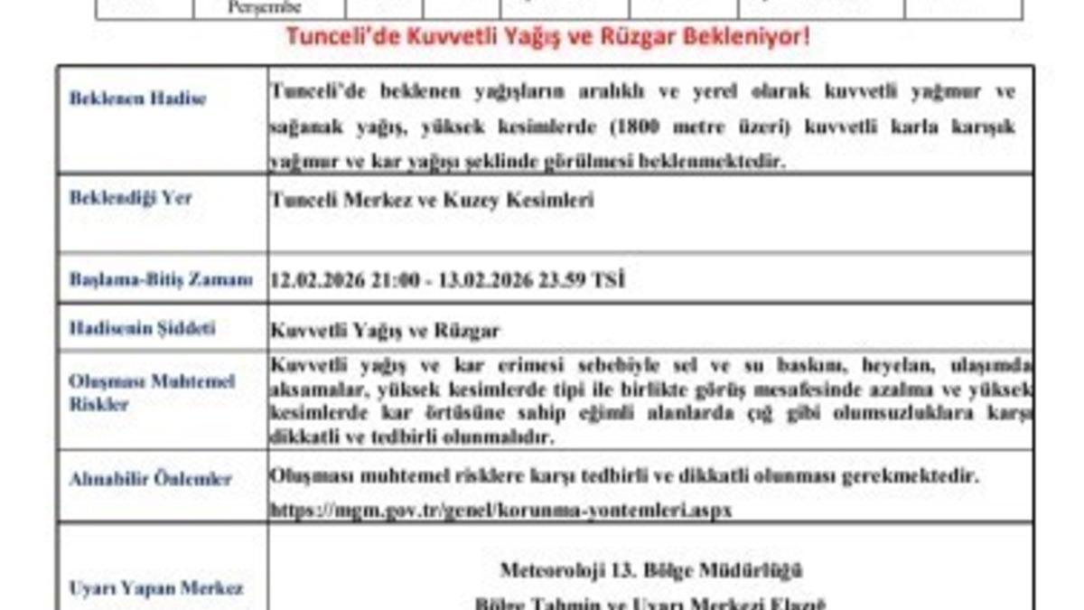 Meteoroloji 13. Bölge Müdürlüğünden yapılan açıklamada, "Tunceli’de beklenen yağışların aralıklı ve yerel olarak kuvvetli yağmur ve sağanak yağış, yüksek kesimlerde (1800 metre üzeri) kuvvetli karla karışık yağmur ve kar yağışı şeklinde görülmesi beklenmektedir. Kuvvetli yağış ve kar erimesi sebebiyle sel ve su baskını, heyelan, ulaşımda aksamalar, yüksek kesimlerde tipi ile birlikte görüş mesafesinde azalma ve yüksek kesimlerde kar örtüsüne sahip eğimli alanlarda çığ gibi olumsuzluklara karşı dikkatli ve tedbirli olunmalıdır" ifadelerine yer verildi.
