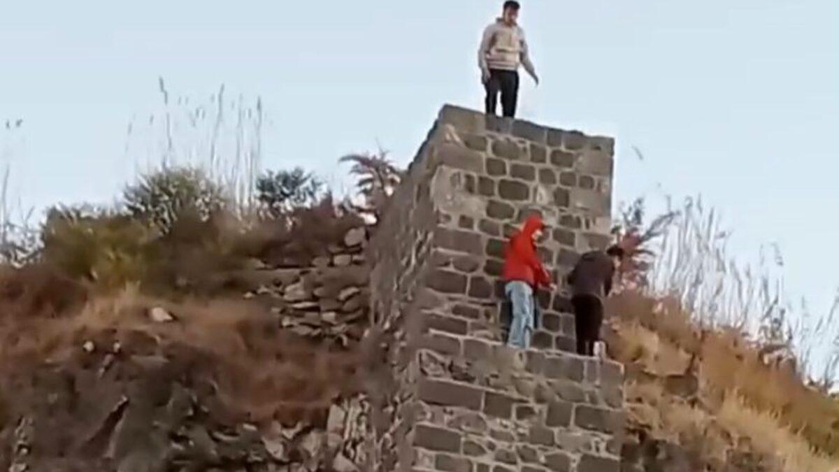 Diyarbakır’da, 3 çocuğun tarihi Surların üzerinde tehlikeli oyunu korku dolu anlar yaşattı, o anlar cep telefonu kamerasına yansıdı.