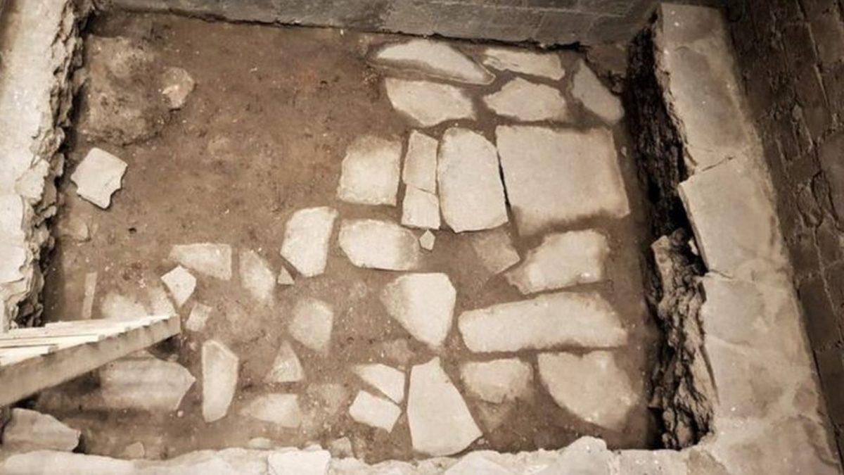 Binanın onarım çalışmalarını yapan işçiler binanın tabanının altında bazalt plakalardan oluşan daha eski bir yer döşemesi bulunduğunu fark etti.
