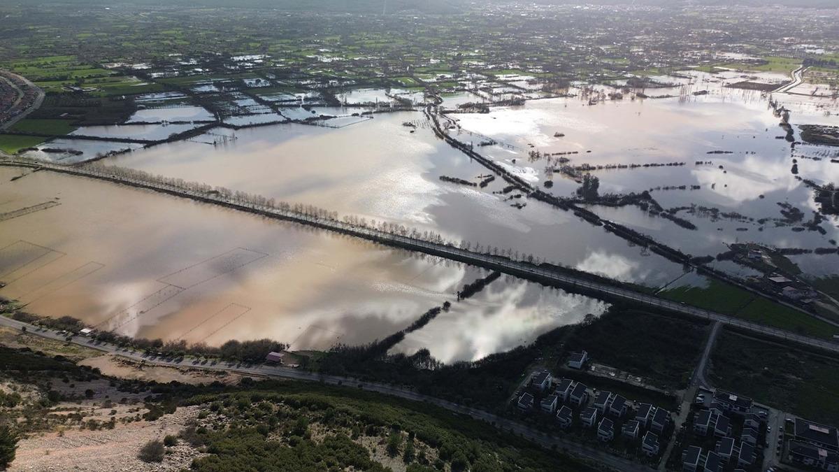 Öte yandan, su altında kalan tarım arazileri dronla görüntülendi.