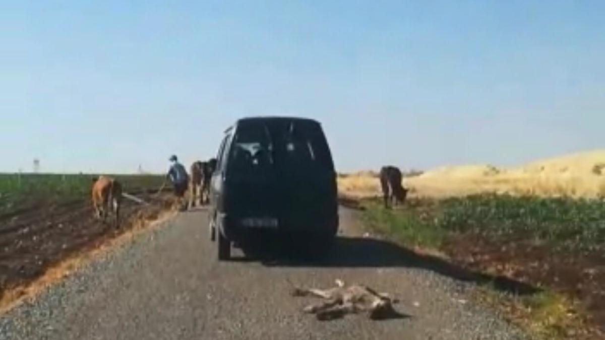 Diyarbakır'da bir sürücünün ölü sıpayı kullandığı hafif ticari aracın arkasına bağlayıp sürüklediği anlar, cep telefonu kamerasıyla görüntülendi.