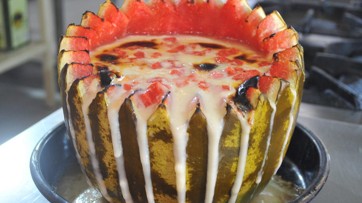 Süt helvasının Osmanlı mutfağında önemli yeri olduğunu belirten Topuk, "Osmanlı'da bir subay tariflerini zamanında reçetelerle saklamış. Biz bu tariflerin içinde bal kabağının içinde pişen pilavlar ve et yemeklerine rastladık. Helvayı da bal kabağında pişirmeyi denedik ve çok da lezzetli oldu. Ancak nisan ortalarında bal kabağı sezonu bitiyor ve kabaklar daha sulu hale geliyor. Sulu kabaklar da helvanın kıvamını bozuyor. Yazın da toprak bize ne veriyorsa o meyvelerden bol porsiyon sığabilecek karpuzu denedik. Aslında bir denemeydi ancak çok beğenilince düzenli yapmaya başladık" açıklamasında bulundu.
