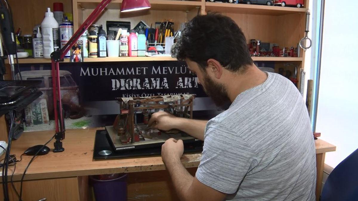 İş çıkışı ve hafta sonları evde diorama sanatı ile uğraşan Muhammet Mevlüt Aydın, el emeği ürünleri satarak ek gelir sağladığını söyledi. Aydın, yaklaşık 4 yıldır diorama ile uğraştığını söyleyerek, "İlk önce bu işe hobi olarak başladım. Ürün yaptıkça isteyenler de çoğalmaya başladı. Ben de belli bir ücret karşılığında satışlarını gerçekleştirdim. Şu anda da hem hobi hem de ek gelir olarak devam ediyorum. Malzemelerin genelini fabrikasyon ürünler olarak internetten temin ediyorum. Bazılarını da kendi elimle yapıyorum ya da kalıplarını çıkarıp, boyayıp maketlerin içerisinde kullanıyorum" dedi.
