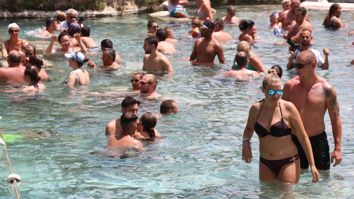 Deniz TOKAT/DENİZLİ, (DHA)- DENİZLİ'de bulunan UNESCO Dünya Kültür Mirası Listesi'ndeki Pamukkale'de, 2 bin 500 yıllık tarihi Antik Kleopatra Havuzu, ziyaretçi akınına uğruyor. Sezonun en yoğun günlerini yaşayan antik havuzda, dünyanın dört bir yanından gelen ziyaretçiler, tarihi sütunlar arasında yüzmenin tadını çıkarıyor.