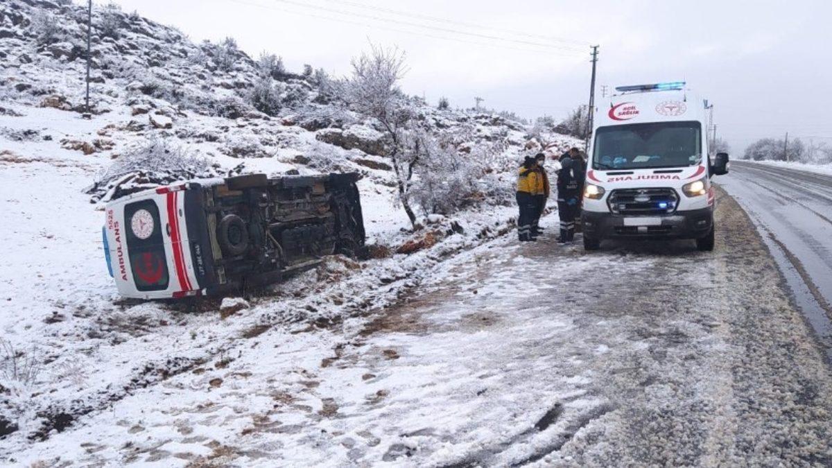Gaziantep’te hasta almaya giden ambulans karlı yolda kayarak şarampole devrildi. Kazada, ambulans sürücüsü yaralanırken, araçta bulunan sağlık çalışanları kazadan yara almadan kurtuldu.