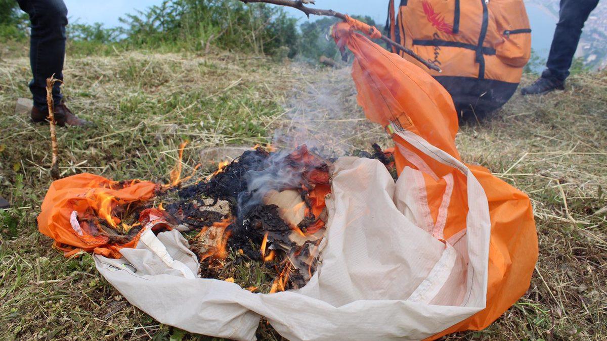 Mustafa KIRLAK/ORDU,(DHA)-ORDU’nun Altınordu ilçesinde, yamaç paraşütçüleri, 530 rakımlı Boztepe’de getirilen yasağı paraşütlerini ateşe vererek, protesto etti.