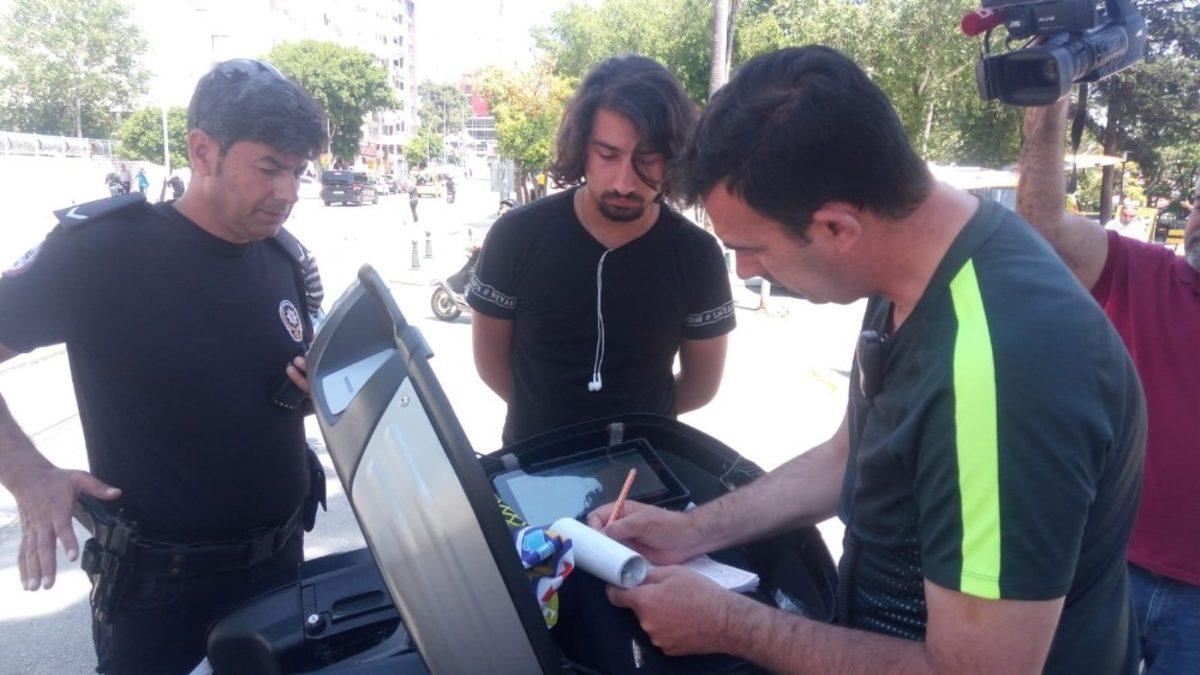 Muratpaşa ilçesinin Cumhuriyet Caddesi’nde, şehir içi yolcu otobüsüne patenli bir gencin tutunarak ilerlemesi polisin dikkatinden kaçmadı. Polis ekiplerince yakalanan 19 yaşındaki Deniz Karataş’a trafiği tehlikeye düşürmekten 108 lira para cezası kesildi.