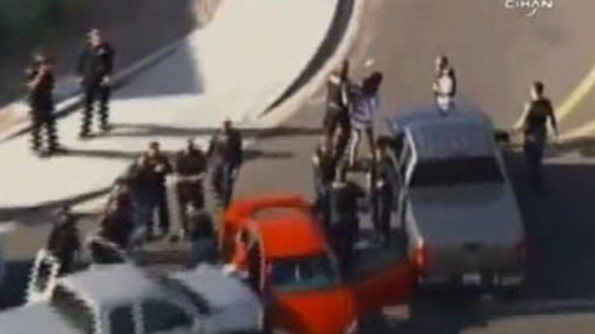 Hızla yol alan araç ancak bir kavşakta başka bir araca çarparak durabildi. Kaza anı da saniye saniye görüntülendi. Esrarengiz araçlar bu kez de kaza yerine geldi. Kaçırılan arabadan bir kadın çıkartılarak gözaltına alındı, erkek sürücünün ise bacağından yaralandığı bildirildi. Üzerinde hiçbir işaret olmayan esrarengiz araçların da polislere ait olduğu belirtildi.