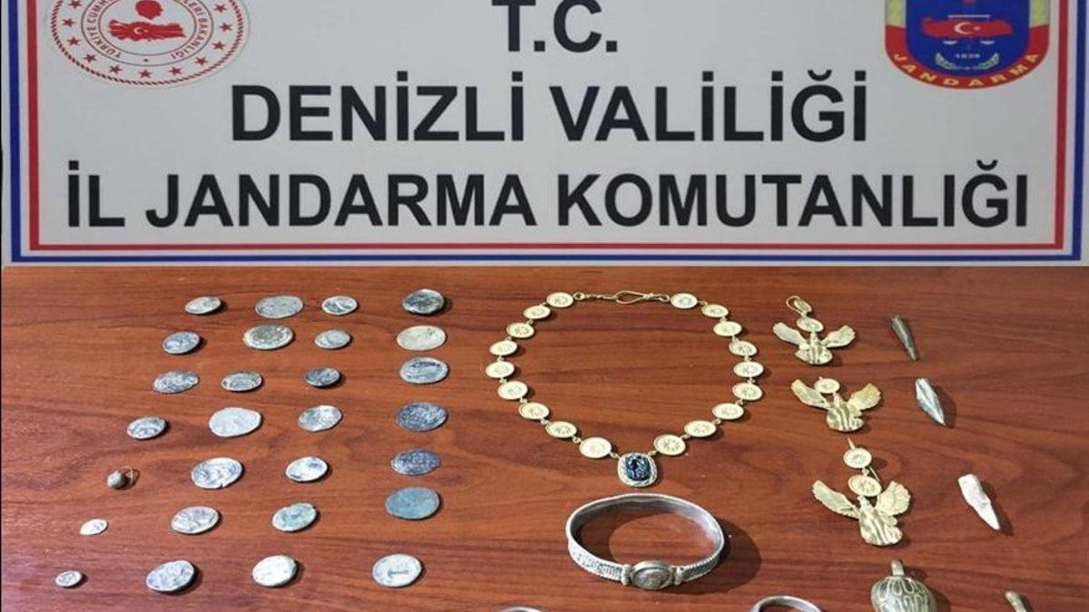 Denizli’de jandarmanın gerçekleştirdiği tarihi eser operasyonunda Roma dönemine ait olduğu tahmin edilen gerdanlık, bileklik, küpe ve yüzükten oluşan bronz takı seti ele geçirildi.