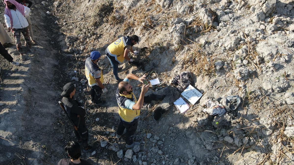Ateybe bölgesinde dün sivillerin yürüyüşü sırasında ortaya çıkarılan toplu mezarda Suriye Afet Bakanlığına bağlı ekiplerin çalışmaları sürüyor.