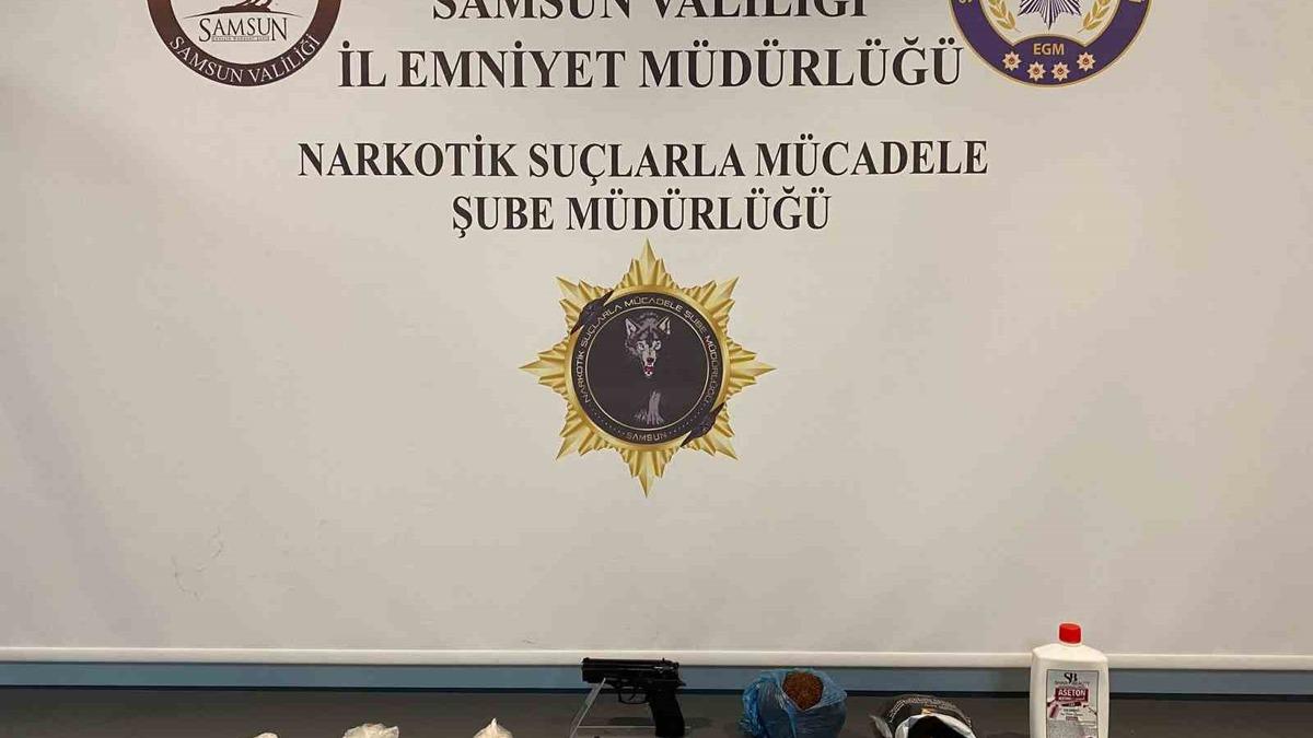 Samsun Emniyet Müdürlüğü Narkotik Suçlarla Mücadele Şube Müdürlüğü ekipleri, yürüttükleri çalışma kapsamında tespit edilen adrese operasyon düzenledi. İncelemelerini çatı katına yoğunlaştıran ekipler, uyuşturucu maddelerin burada gizlendiğini belirledi. Operasyonda 521 gram bonzai (sentetik kannabinoid), 212,41 gram metamfetamin, 150 ml sentetik kannabinoid elde etmeye yarayan sıvı, 1 adet uyuşturucu kullanım aparatı ve 1 adet kurusıkı tabanca ele geçirildi. Olayla ilgili A.K. (68) gözaltına alınırken, soruşturmanın sürdüğü bildirildi.