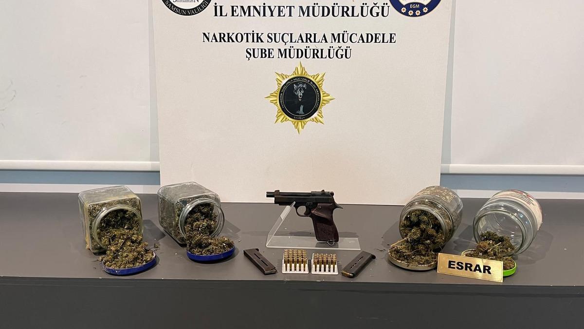 İki ilçede belirlenen adreslerde yapılan aramada, 211 gram esrar, 3 ruhsatsız tabanca, 2 şarjör ve 69 fişek ele geçirildi.