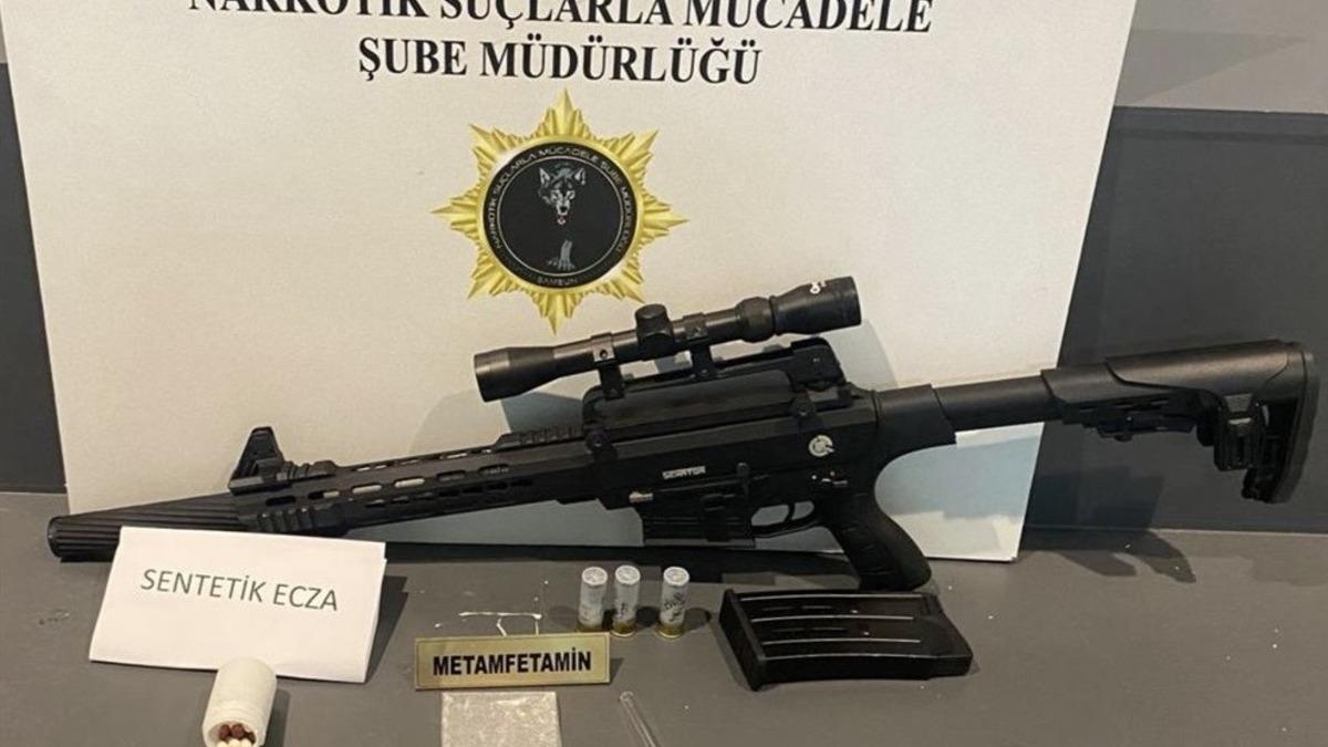 Ekipler, 3 bin 167 sentetik ecza, 71 gram uyuşturucu, hassas terazi, ruhsatsız pompalı tüfek, 2 uyuşturucu madde kullanım aparatı ele geçirdi.