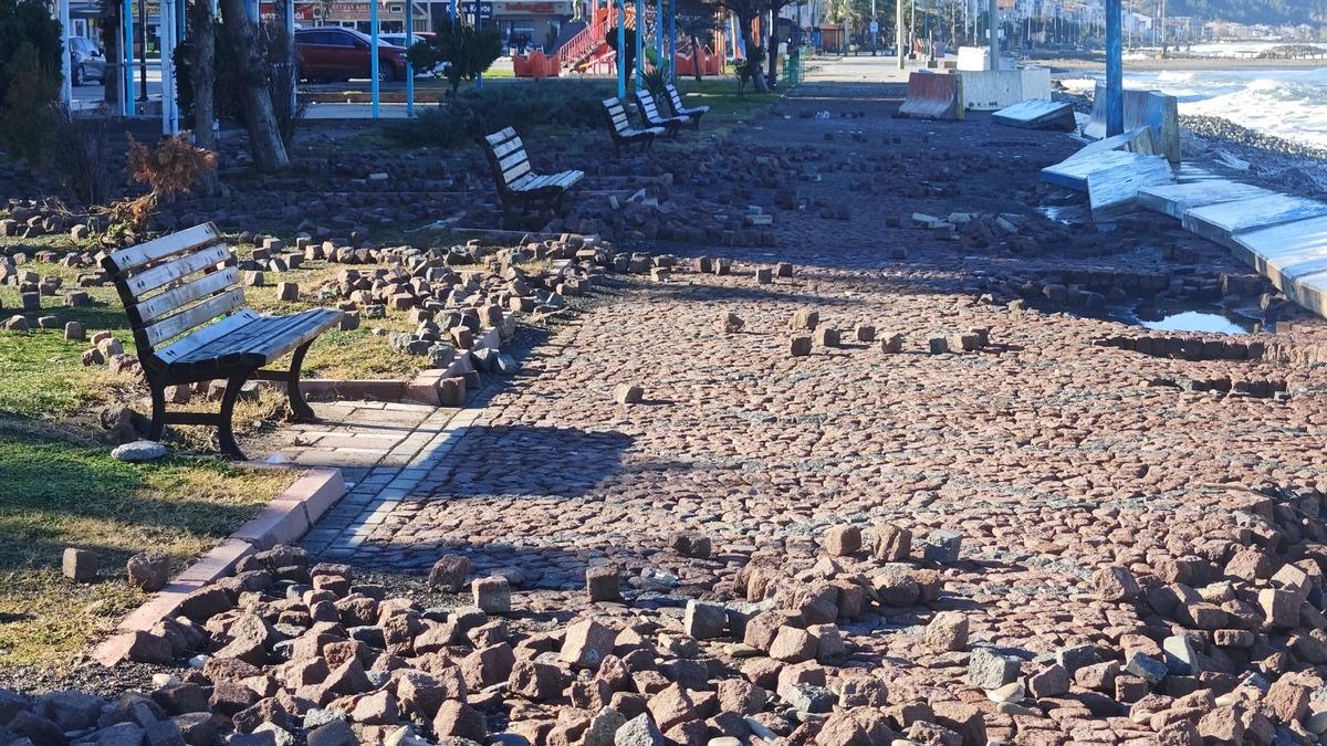 İlçe merkezinin sahilindeki kaldırım taşlarının da dalgalar nedeniyle yerinden sökülerek kıyıya savrulduğu görüldü.