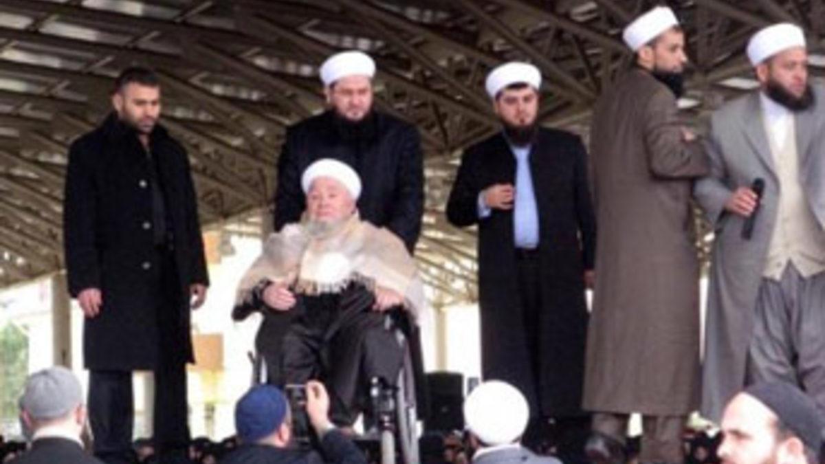 Alana lüks cipiyle gelen İsmailağa Cemaati Lideri dualar arasında tekerlekli sandalyeye konularak platforma çıkarıldı.