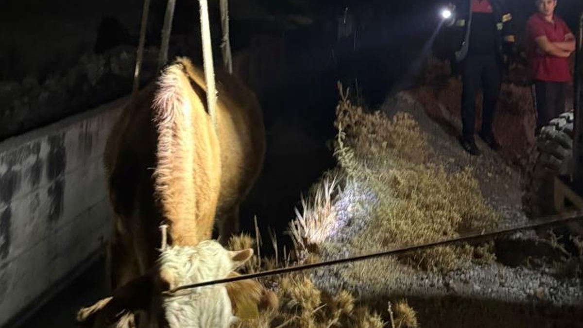 Siirt'te atık su arıtma kanalına düşen inek, itfaiye ekiplerinin halatlı ve kepçeli müdahalesi sonucu kurtarıldı.