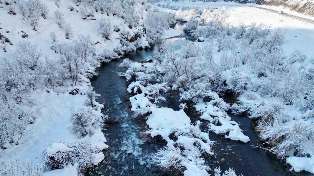 Şırnak’ın Beytüşşebap ilçesinden geçen Yeşilöz deresi çevresinde kar yağışı sonrası görsel şölen oluştu. Mağara, dere yatağı ve ağaçların beyazlar içinde kaldığı bölgeler göz kamaştırdı. Beyazın güzelliğini yansıdığı görüntüler dronla kaydedildi.