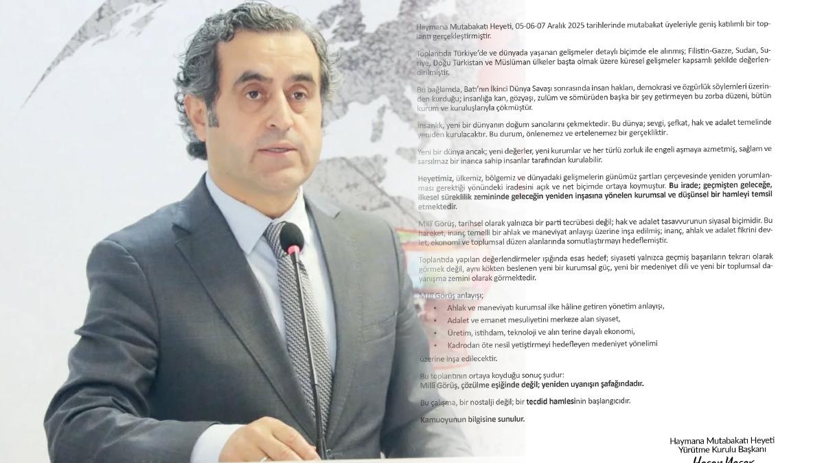 Saadet Partisi ve Yeniden Refah Partisi'nin yanı sıra Milli Görüş ideolojisini benimseyen bir parti daha yolda. Haymana Mutabakatı Heyeti, üç gün süren toplantılarının ardından sonuç bildirisi yayınladı. Bildiride yeni siyasi parti sinyali olarak yorumlanan mesajlar verildi.