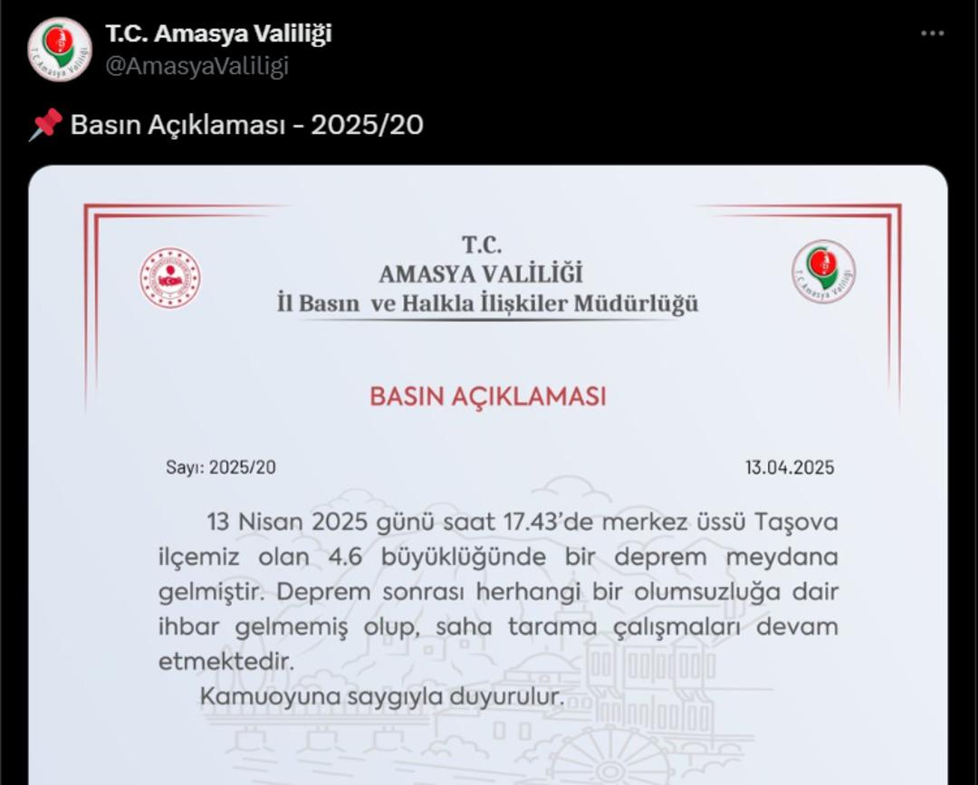Korkutan depremin ardından Amasya Valiliği tarafından açıklama yapıldı. Açıklamada, "13 Nisan 2025 günü saat 17.43'de merkez üssü Taşova ilçemiz olan 4.6 büyüklüğünde bir deprem meydana gelmiştir. Deprem sonrası herhangi bir olumsuzluğa dair ihbar gelmemiş olup, saha tarama çalışmaları devam etmektedir" denildi.