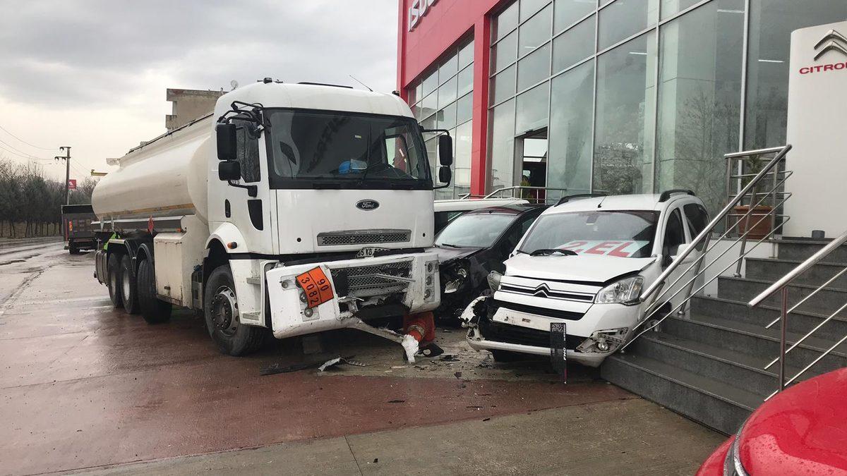 Dinçer AKBİR- Alişan KOYUNCU/BAŞİSKELE (Kocaeli), (DHA)- KOCAELİ'nin Başiskele ilçesinde, viraja hızlı giren tanker, kontrolden çıkarak oto galeri önündeki araçlara çarptı. Tankerin çarptığı 3 hafif ticari araç hasar gördü.