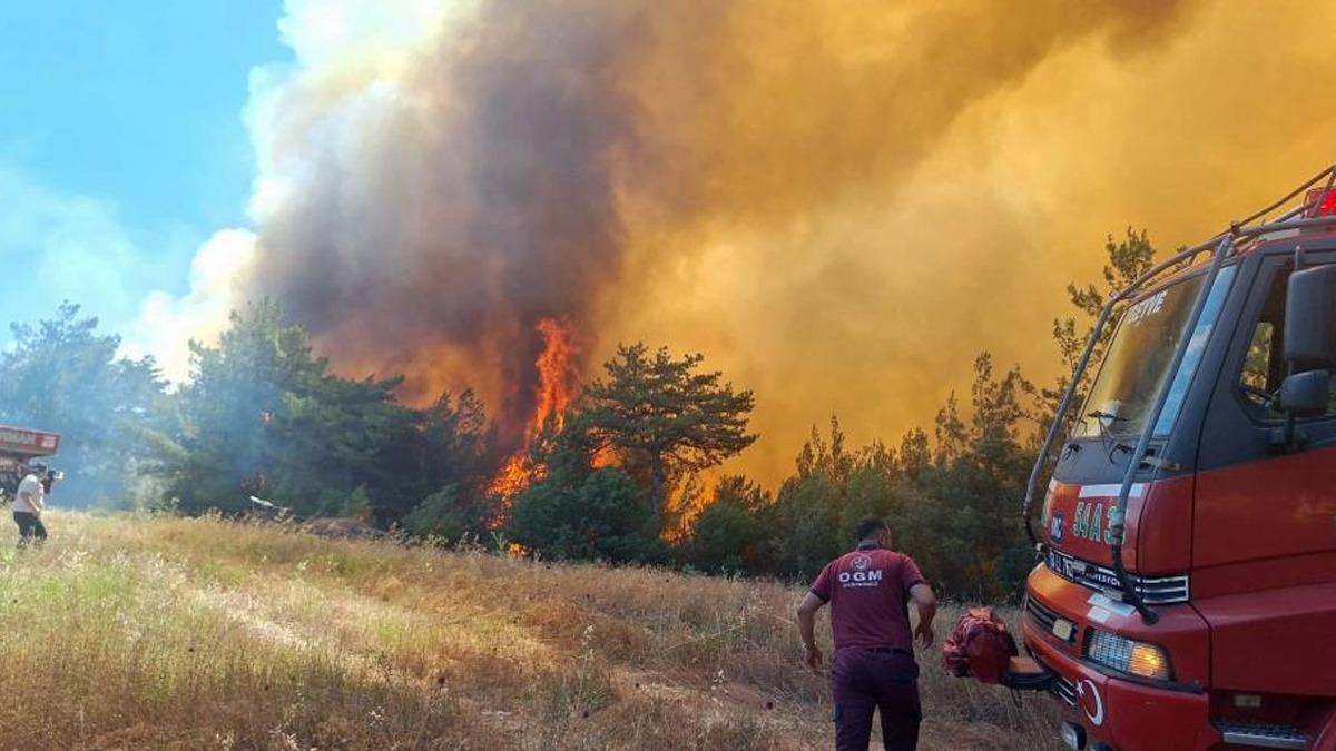 Sakarya'nın Taraklı ilçesinde ormanlık alanda çıkan yangın helikopterden görüntülendi. Ekipler, yangını söndürebilmek için havadan ve karadan seferber oldu.