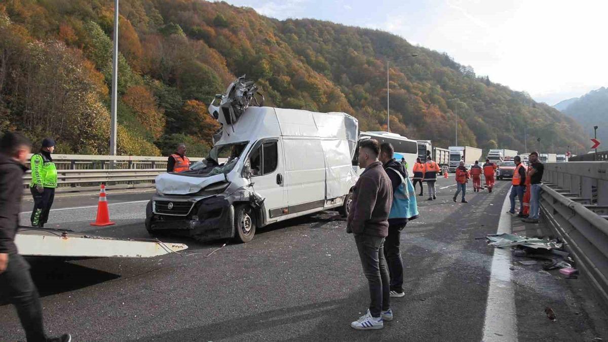 Kaza, TEM Otoyolu’nun Bolu Dağı Tüneli çıkışında 2. Viyadük mevkiinde meydana geldi. İstanbul istikametinde seyreden F.K. idaresindeki tır, C.A. yönetimindeki yolcu otobüsü ile çarpıştı. Aynı istikamette seyreden A.Y. hakimiyetindeki panelvan da kazaya karıştı. Kazada panelvan otoyolda devrildi. Yan yatan araç içerisindeki sürücü A.Y. yaralandı. 112 Acil Çağrı Merkezi’ne yapılan ihbar üzerine bölgeye sağlık, jandarma ve itfaiye ekipleri sevk edildi.