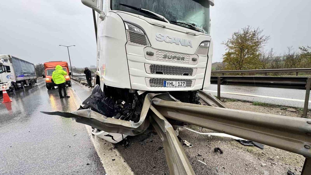 Edirne’de E-80 Avrupa Otoyolunda seyreden E.Y’nin kullandığı tır, şiddetli sağanak sebebiyle sürücünün direksiyon hakimiyetini kaybetmesi sonucu bariyerlere çarptı.