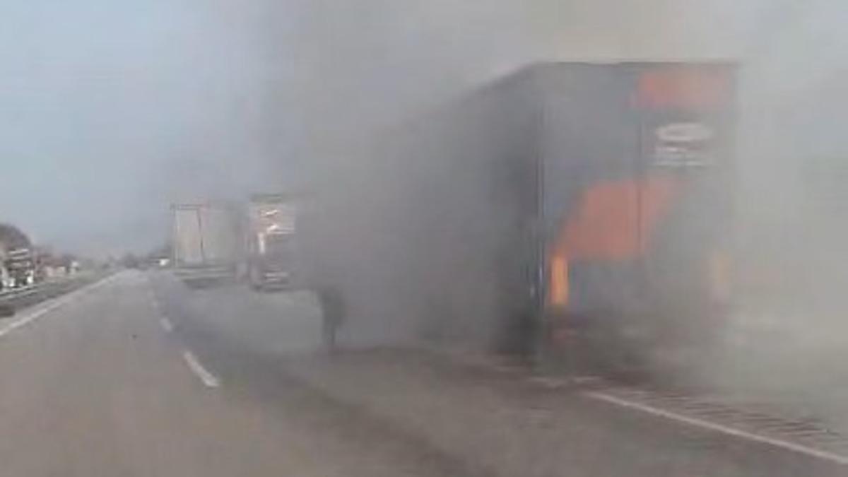 Tokat’ta tırın dorsesinden yükselen dumanlara hızla müdahale eden sürücü, çekiciyi ayırıp yangın söndürme tüpüyle lastiklere müdahale ederek muhtemel faciayı önledi.