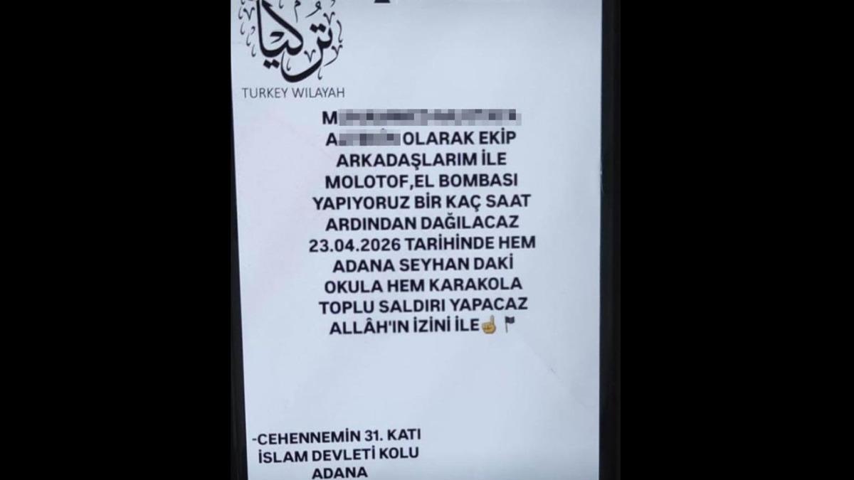 Adana'da sosyal medya hesabından 'saldırı yapacağız' paylaşımı yapan şahsın gözaltına alındığı bildirildi. Edinilen bilgiye göre, M.M.A. isimli şahıs sosyal medya hesaplarında, "Hem okula hem de karakola saldırı yapacağız" şeklinde paylaşımlarda bulundu.