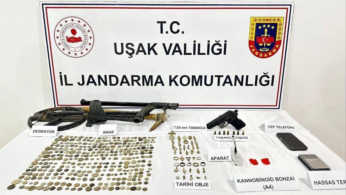 Uşak İl Jandarma Komutanlığı’na bağlı ekipler, edinilen bilgiler çerçevesinde Eşme ilçesine bağlı Kayalı köyünde ikamet eden E.Y. (18) ve A.Y’nin (50) adreslerine operasyon düzenledi. Adreslerde yapılan aramalarda 1 adet tabanca, 1 adet tabanca şarjörü, 7 adet tabanca fişeği, bir miktar bonzai, 1 adet dedektör, 1 adet hassas terazi, 320 adet sikke ve 30 adet tarihi obje ele geçirildi. Yapılan operasyon kapsamında gözaltına alınan E.Y. Ve A.Y. hakkında adli işlem başlatıldığı öğrenildi.