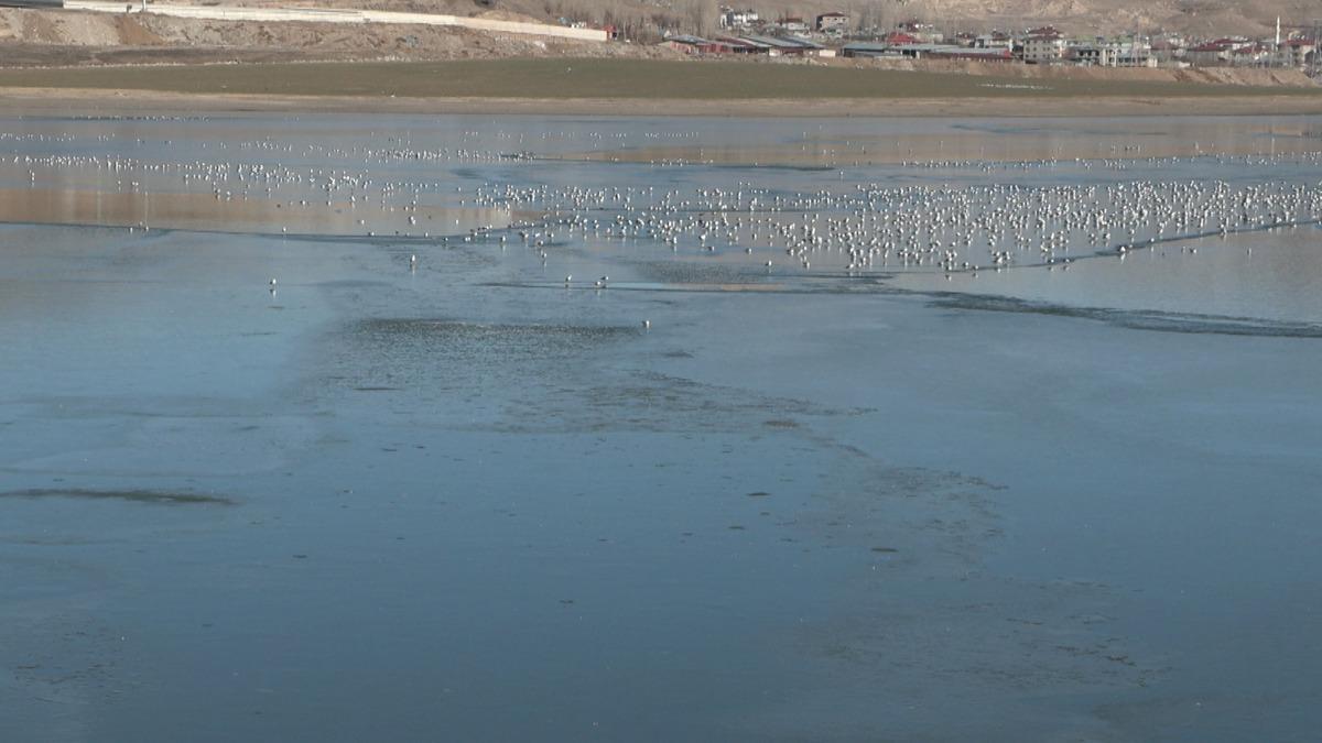Van'daki Sıhke Gölü'nün yüzeyi bir süredir etkili olan soğuk hava nedeniyle kısmen dondu.