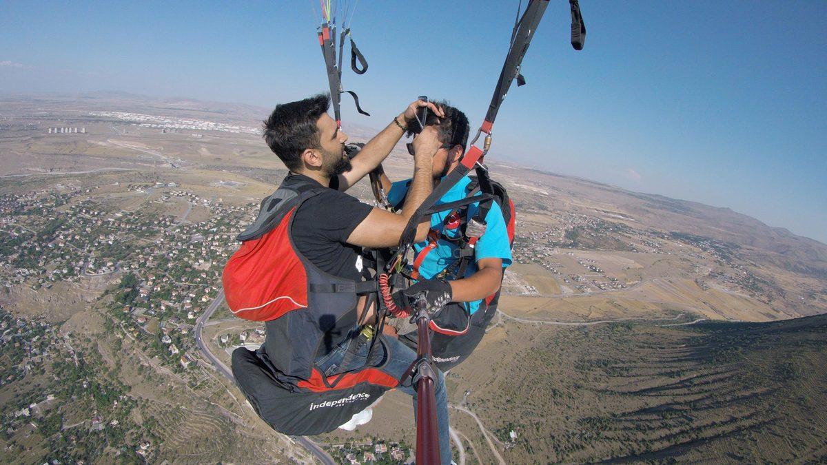 Kayseri'de kuaförlük yapan Tugay Sungur ve tandem pilotu Emrullah Çenet, Talas ilçesinde bulunan, 1870 rakımlı Ali Dağı'ndan yamaç paraşütüyle atlayış yaptı. Sungur, gökyüzünde süzülürken, tandem pilotu Çenet'i tıraş etti. 10 yıldır kadın ve erkek kuaförlüğü yaptığını belirten Tugay Sungur, "Mesleğimizi ileri noktalara getirmek için elimizden geleni yapıyoruz. Farklılık olsun, dedik; havada tıraş yaptık. İlk uçuşum olduğu için garip hissettim ama bir süre sonra havaya ve rüzgara alışıyorsun. Havada da tıraş yapılabilir" diye konuştu.