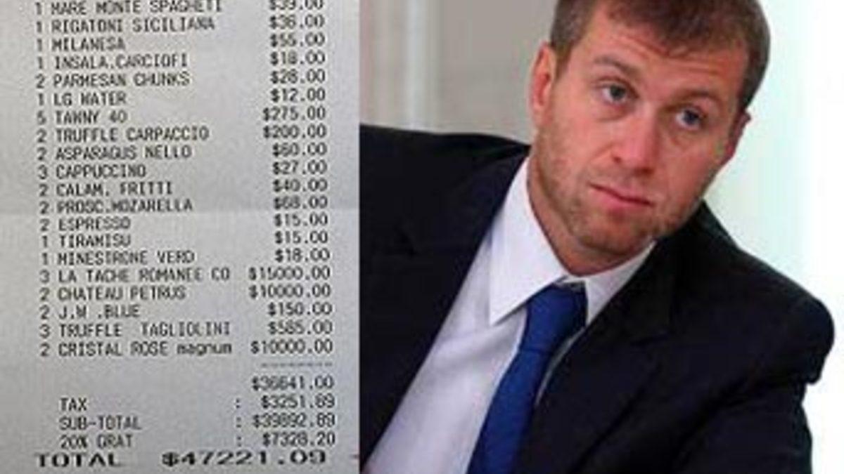 Roman Abramoviç, son olarak New York’ta sevgilisi Daria Zhukova ve dostlarıyla birlikte öğle yemeği için gittiği Nello Restaurant’da 47 bin 221.09 dolar hesap ödedi.Abramoviç’in servisle birlikte ödediği toplamrakamise 52 bin dolar (75.250 TL) oldu. Kentin en zengin restoranları arasında olan Nello Restaurant’da 10 kişilik yer ayırtan Abramoviç ile dostları şarap içip, et yemeği olarak fileminyon ve tatlı olarakda beyaz çikolatalı trüf yedi. Yemekte içilen iki şişe Petrus şarabın fiyatının 10 bin dolar olduğu açıklandı.İçilen 3 şişe Romanee Conti’ye 15 bin dolar, 2 şişe Cristal Rose şampanyası için 10 bin dolar ödendi.