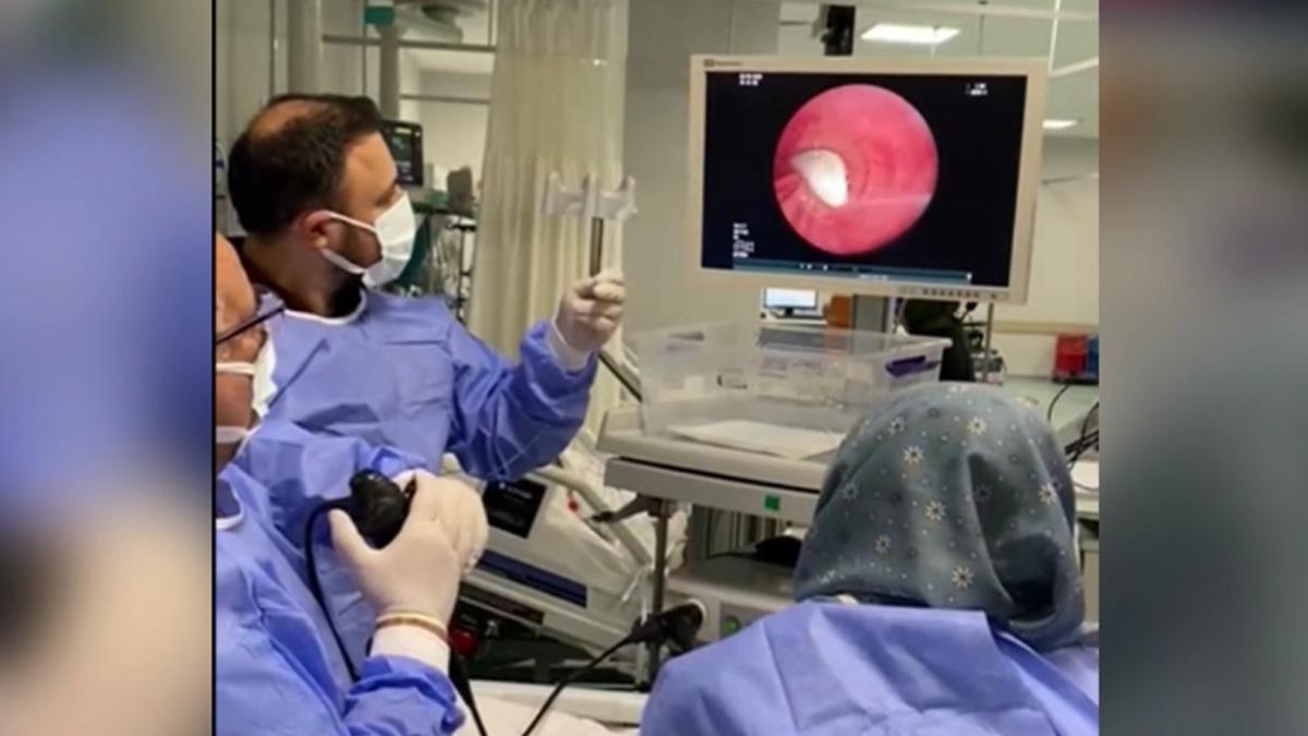 Dr. Hüsamettin Sazlıdere, hastanın genel anesteziye gerek duyulmadan normalde böbrek taşlarının çıkarılmasında kullanılan üreter kateteri basketi ile yabancı cismin akciğerden çıkarıldığını söyledi. Sazlıdere, “Hastanemize nefes darlığı ve morarma şikayetiyle başvuran hastanın tomografisinde sol alt lobda tıkanıklık görüldü. Fleksibl bronkoskopi ile yapılan incelemede sol ana bronş distalinde yabancı cisim saptandı. Bu cisim üreter kateteri basketiyle başarılı şekilde çıkartıldı. Hastamız sağlığına kavuştu” dedi.