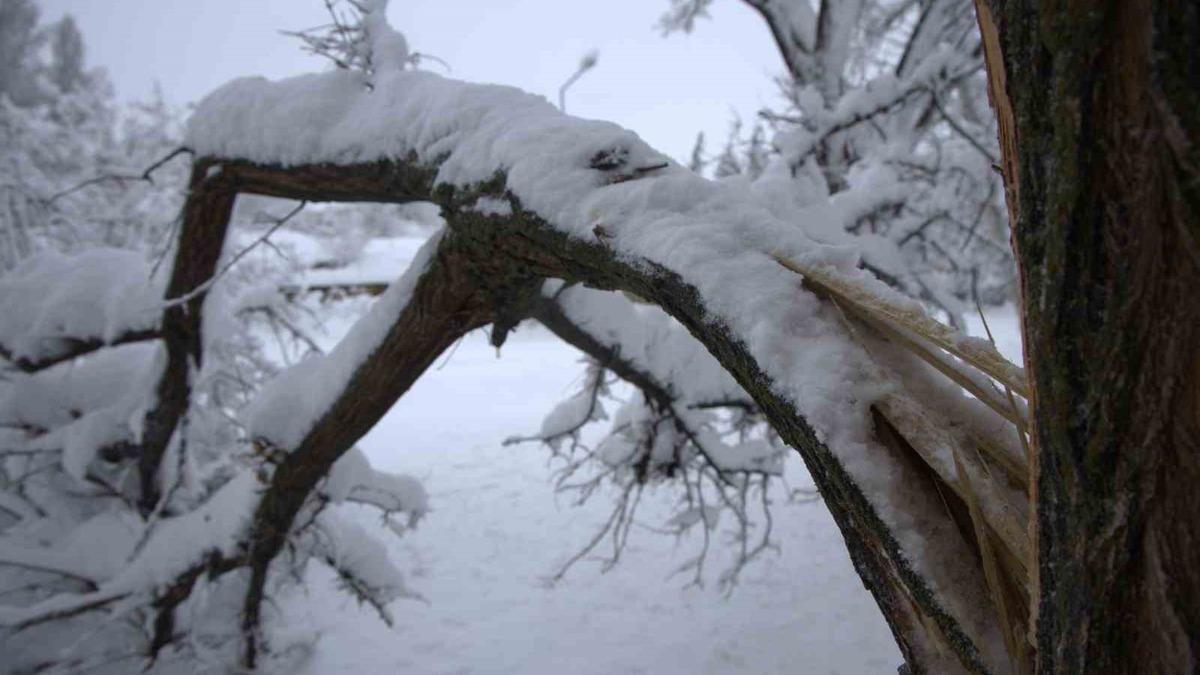 Elazığ’da etkisini artıran yoğun kar yağışı sonrası Harput Mahallesi’nde karın ağırlığına dayanamayan çok sayıda ağacın dalları ve gövdeleri kırıldı.