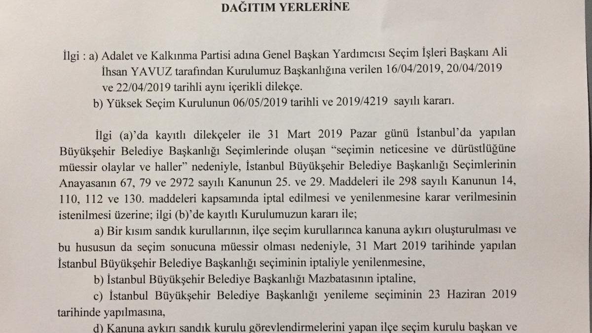 İstanbul Büyükşehir Belediye Başkanlığı seçimlerinin yenilenmesine ilişkin YSK'nın aldığı kısa karar ortaya çıktı. Kararda AK Parti’nin İstanbul seçimlerinin iptalini ve yenilenmesini istediği anımsatılarak, "Bir kısım sandık kurullarının, ilçe seçim kurullarınca kanuna aykırı oluşturulması ve bu hususun da seçim sonucuna müessir olması nedeniyle, 31 Mart 2019 tarihinde yapılan İstanbul Büyükşehir Belediye Başkanlığı seçiminin iptaliyle yenilenmesine, İstanbul Büyükşehir Belediye Başkanlığı Mazbatasının iptaline, İstanbul Büyükşehir Belediye Başkanlığı yenileme seçiminin 23 Haziran 2019 tarihinde yapılmasına, kanuna aykırı sandık kurulu görevlendirmelerini yapan ilçe seçim kurulu başkan ve üyeleri ile seçim müdürleri ve diğer sorumlular hakkında suç duyurusunda bulunulmasına, oyçokluğuyla karar verilmiştir" denildi.