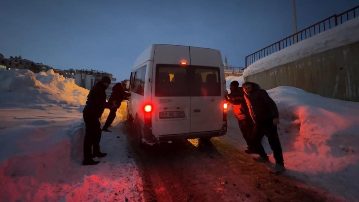 Vatandaşların yaklaşık 2 saat süren zorlu çalışması ve el birliğiyle itilmesi sonucu minibüs, mahsur kaldığı buzlu alandan kurtarıldı.